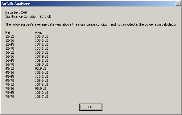 The significance condition equals the average frequency response expressed in dB between 100 MHz and 250 MHz. If the average measured ANEXT loss or AFEXT loss between 100 MHz and 250 MHz exceeds the significance condition, then the entire ANEXT loss or AFEXT loss response is excluded (discarded) in the power sum computation. If the average measured ANEXT loss or AFEXT loss between 100 MHz and 250 MHz does not exceed the significance condition, then the entire ANEXT loss or AFEXT loss response is included in the power sum computation. The value of the significance condition is 90 dB.